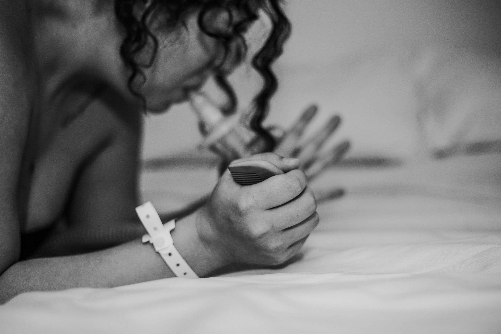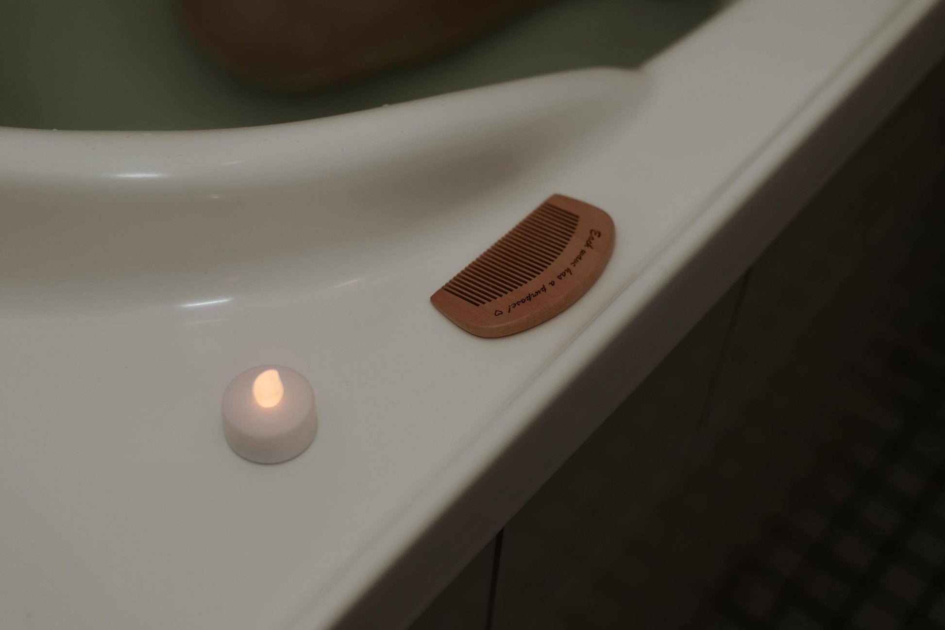 Hold the comb with its teeth positioned just below the meeting point of your fingers and palm. When you sense a contraction approaching, gently close your hand around the comb, allowing its teeth to press into the palm of your hand. Adjust the pressure to your liking, using as much or as little force as feels most soothing and comforting for you.
