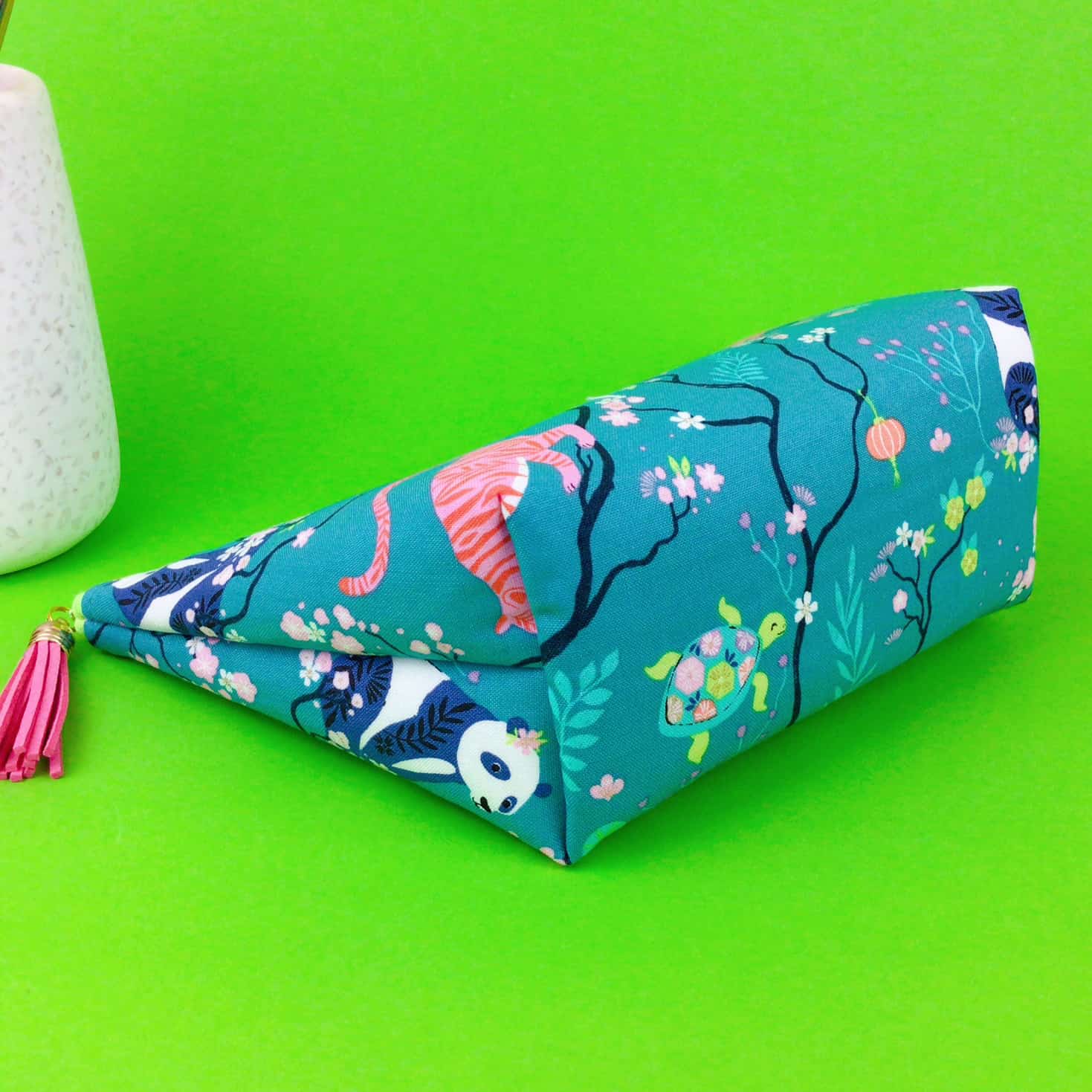 The outer fabric is Teal Pandas and Tigers Print.