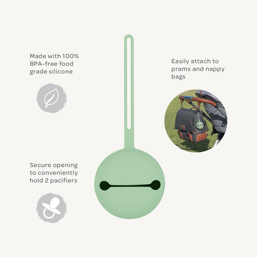 Extra pacifiers will always be kept clean and conveniently within arms reach with this handy portable pacifier case. Made from BPA-free, food grade silicone this case easily loops onto nappy bags, prams and bumper bars.